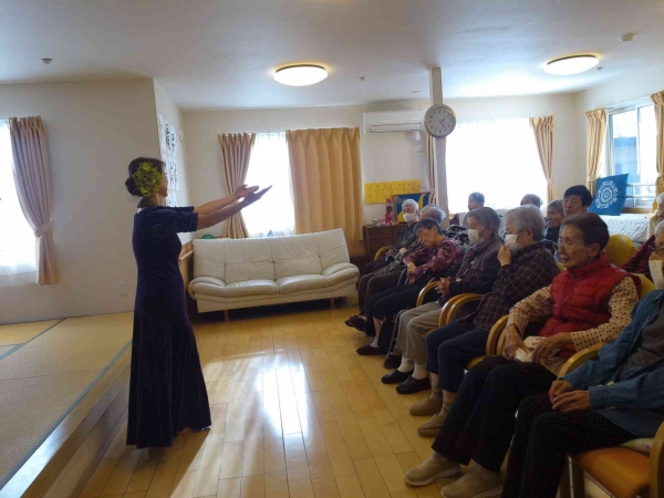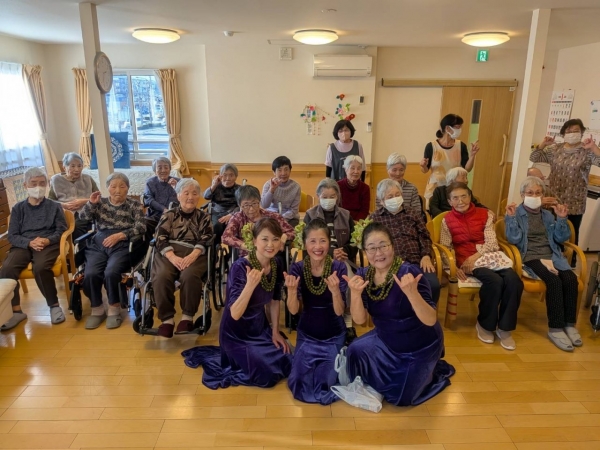 今年の新年会の様子です。今年のメインイベントは職員の知り合いの方をお招きしてフラダンスを踊っていただきました。外は寒い日々が続きますが、ゲストの方の華麗な踊りと「アロハ―」の掛け声に常夏のハワイを思わせる穏やかな一日となりました。