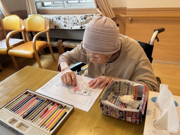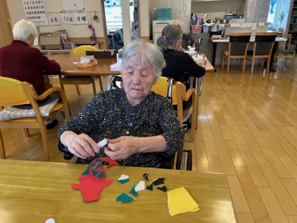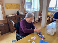 もうすぐ子供の日とのことなので今回は鯉のぼりのオブジェ制作の様子です。皆さん最初は戸惑っていましたが職員が手順を教えると徐々にペースを掴み手際よく行っていました。また、朝の掃除では皆さんクイックルワイパーを持ち自分の居室やリビングを熱心に掃除していました。